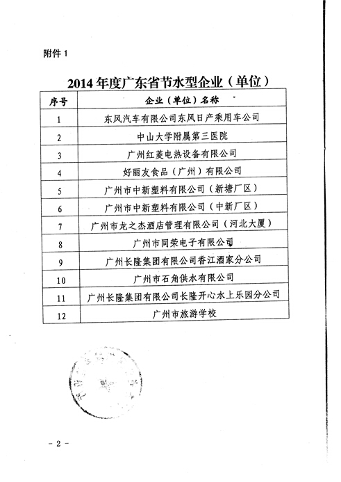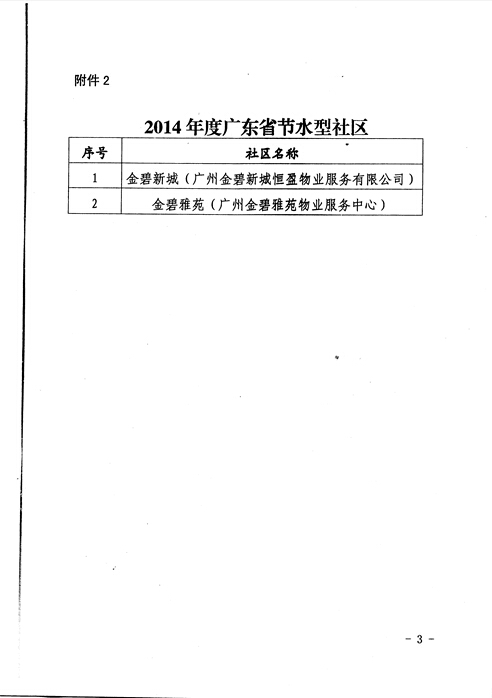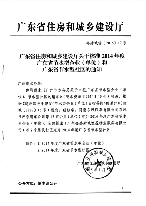 根据《建设部关于印发<节水型企业(单位)目标导则>的通知》(建城﹝1997)45号)规定,经核准,同意东风汽车有限公司东风日产乘用车公司等12家企业(单位)定为2014年度广东省节水型企业(单位),金碧新城(广州金碧新城恒盈物业服务有限公司)等个居民社区定为2014年度广东省节水型社区。