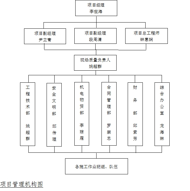 (3)建立一套行之有效的管理组织:施工现场组成项目经理部(详见本项目管理组织架构图),由项目经理、项目副经理、项目总工、工程技术部、安全文明部、物资设备部、合同管理部、财务部、综合办公室、各施工队伍及班组等组成组织机构,各员工负责管理到位。工程项目部行使计划、组织、协调、监控、指挥等职能全权处理项目中的技术管理、协调一切事物、确保工程计划的实施,确保工程质量、施工安全和资金使用,按公司的机制进行运作,圆满完成业主方对本工程的质量要求。