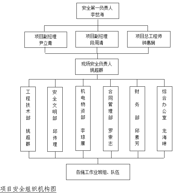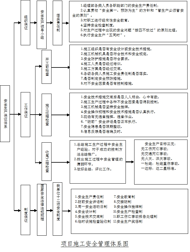 为保证施工安全,促进工程施工的顺利进行,必须认真贯彻执行建设部颁发的“一标三规范”,实现广东省建委的“五无”目标,做到“安全第一,预防为主”。针对本工程特点,建立严密的安全管理体系,对施工现场的安全生产实行统一管理。(详见本项目施工安全管理体系图)
