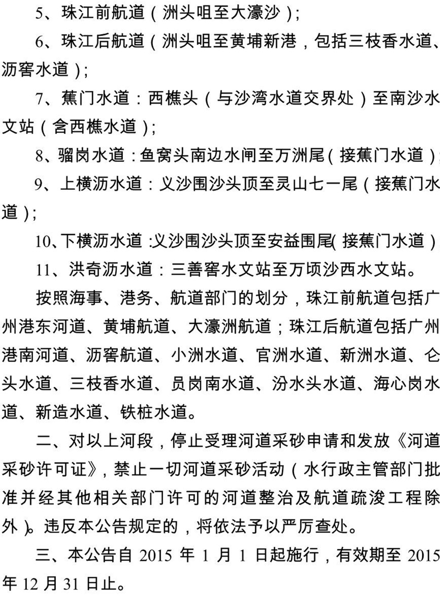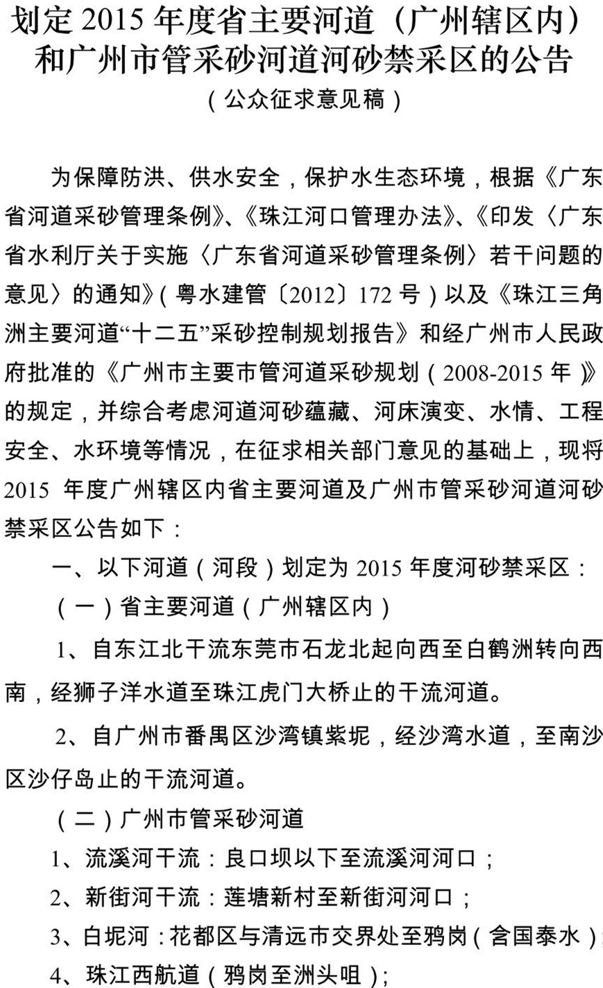 另附“关于划定省主要河道(广州辖区内)和黄播 市管采砂河道2015年度河砂禁采区的公告(公众征求意见稿)”如下: